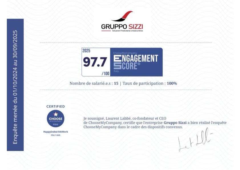 L’ agenzia Gruppo Sizzi ha ricevuto un riconoscimento per il 2025 assegnato alle aziende che dimostrano di garantire benessere e motivazione ai propri dipendenti. Ci è stata conferita La certificazione Happy Index® At Work di ChooseMyCompany grazie ad un sondaggio svolto dai nostri dipendenti riguardo l’ambiente di lavoro, la crescita professionale, la motivazione, retribuzione, pari opportunità, benessere etc..